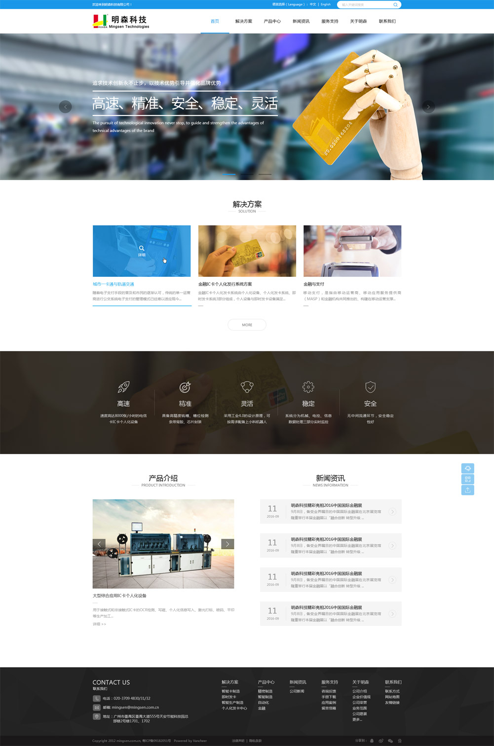 廣州明森科技股份有限公司(原廣州森森機電設備有限公司)成立于1998,致力于智能卡設備、財務相關(guān)系統(tǒng)解決方案的研發(fā)。成套設備,并提供銀行卡、金融IC卡、社保卡、手機卡、智能卡等各種新技術(shù)的個性化服務。