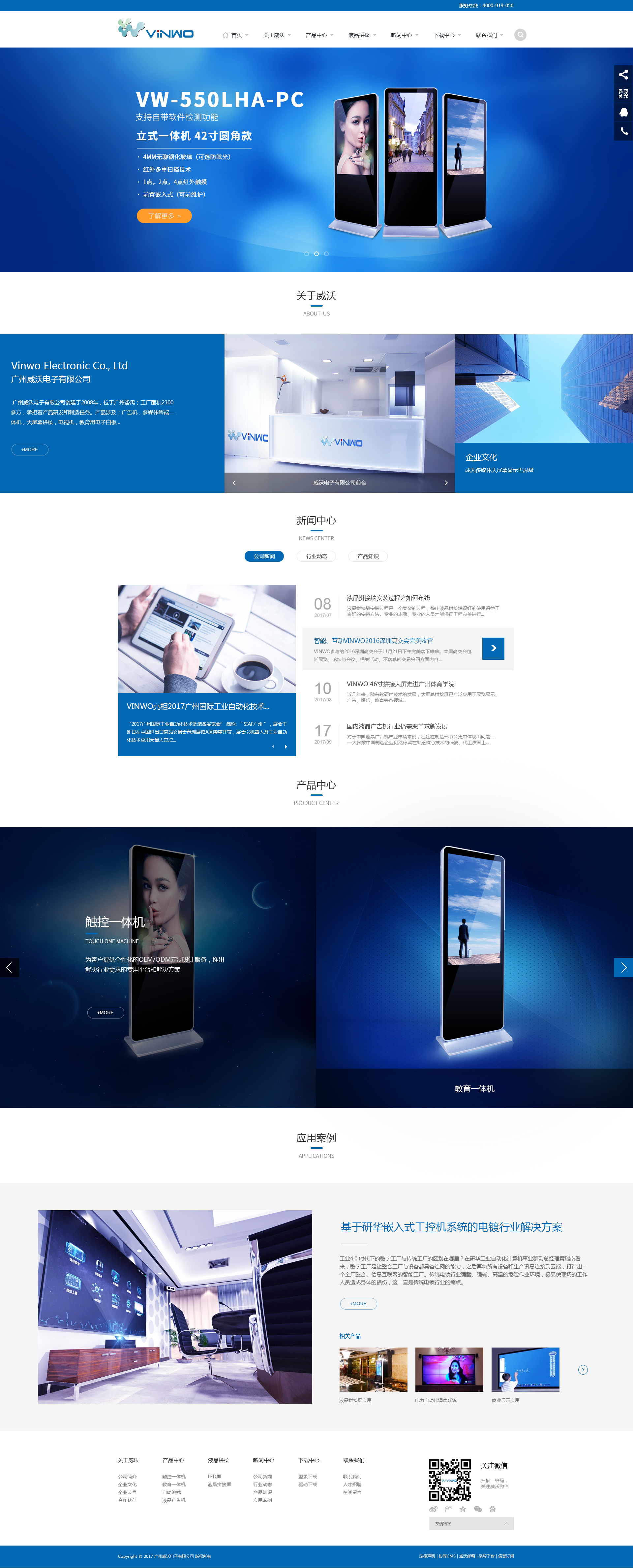 廣州威沃電子有限公司創(chuàng)建于2008年,位于廣州番禺;工廠面積2300多方,承擔(dān)著產(chǎn)品研發(fā)和制造任務(wù)。產(chǎn)品涉及:廣告機(jī),多媒體終端一體機(jī),大屏幕拼接,電視機(jī),教育用電子白板,多媒體展廳規(guī)劃,影視制作策劃等生產(chǎn)、銷(xiāo)售、工程集成和技術(shù)服務(wù)于一體的高新技術(shù)企業(yè)。 廣州威沃電子有限公司自創(chuàng)建以來(lái),實(shí)行高起點(diǎn)發(fā)展戰(zhàn)略,堅(jiān)持不懈地加強(qiáng)和提升科技創(chuàng)新能力,擁有經(jīng)驗(yàn)豐富的技術(shù)研發(fā)團(tuán)隊(duì)和技術(shù)資源,根據(jù)市場(chǎng)和客戶(hù)的需求,開(kāi)發(fā)出具競(jìng)爭(zhēng)力和先進(jìn)性能的各種規(guī)格高清、高亮、高對(duì)比度交互式液晶數(shù)字標(biāo)牌終端顯示設(shè)備、數(shù)字多媒體信息發(fā)布系統(tǒng)、 遠(yuǎn)程高清大屏幕LCD視像會(huì)議系統(tǒng)和超窄邊、高亮、高對(duì)比度、高飽和度高清(1080P)液晶大屏幕拼接屏、大尺寸觸摸面板與液晶面板一體化顯示屏、大尺寸液晶觸摸查詢(xún)終端、數(shù)字智能遙控器、數(shù)字智能電源識(shí)別器等產(chǎn)品和行業(yè)應(yīng)用解決方案。